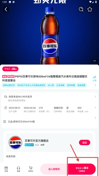 在百事可乐的商品详情页面,找到“学生价·立即购”按钮并点击,随后完成商品的购买流程。