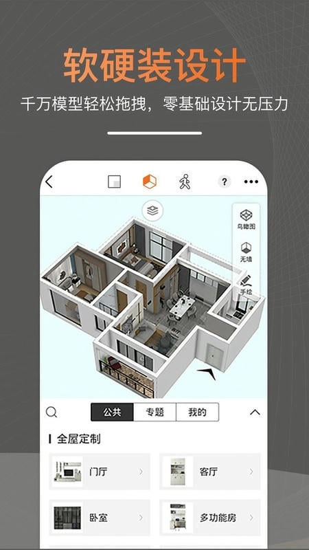 高效成图设计:独创软硬装三层结构设计,海量模型可拖曳布置,支持一键生成720全景效果图,还能导出CAD、3DMAX等专业文件,新手也能轻松上手操作。