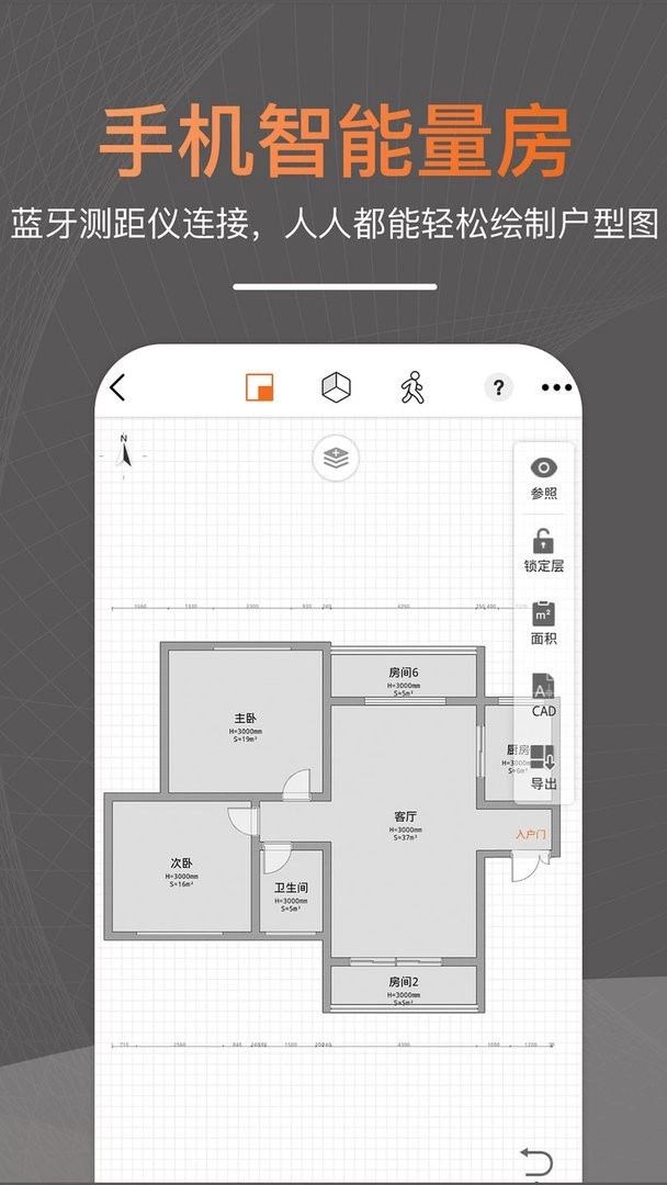 智能量房操作流程:先开启设备连接测距仪或激活扫描功能,对准目标空间执行测量,系统会自动生成户型图;后续可手动添加门窗、梁柱等构件,以还原空间细节。