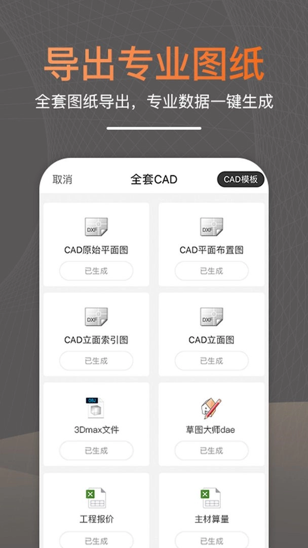 导出与分享成果:在成果页面挑选合适格式,一键导出CAD图纸、报价清单等文件,也能生成H5链接进行分享,便于和客户沟通或开展存档协作。