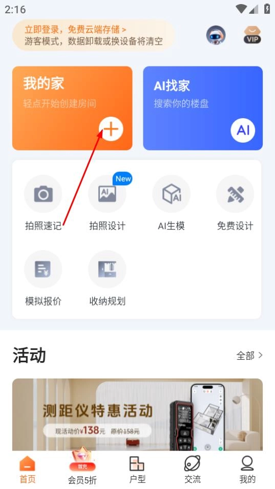 打开知户型应用后,找到“我的家”区域,点击该区域内的加号按钮,此时会弹出创建选择的对话框。