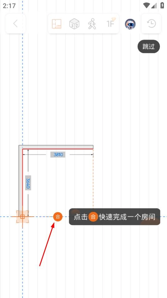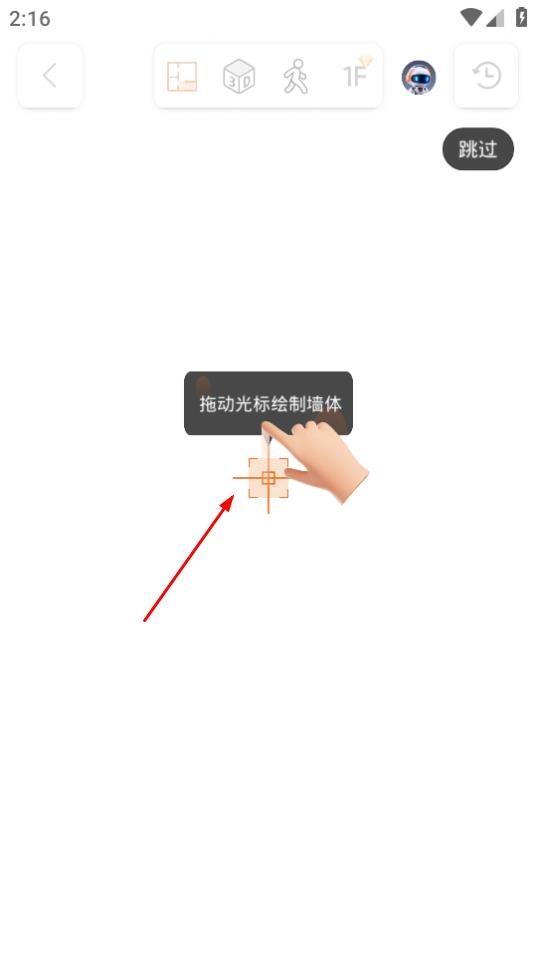在户型绘制引导页面,根据提示拖动光标绘制墙体。