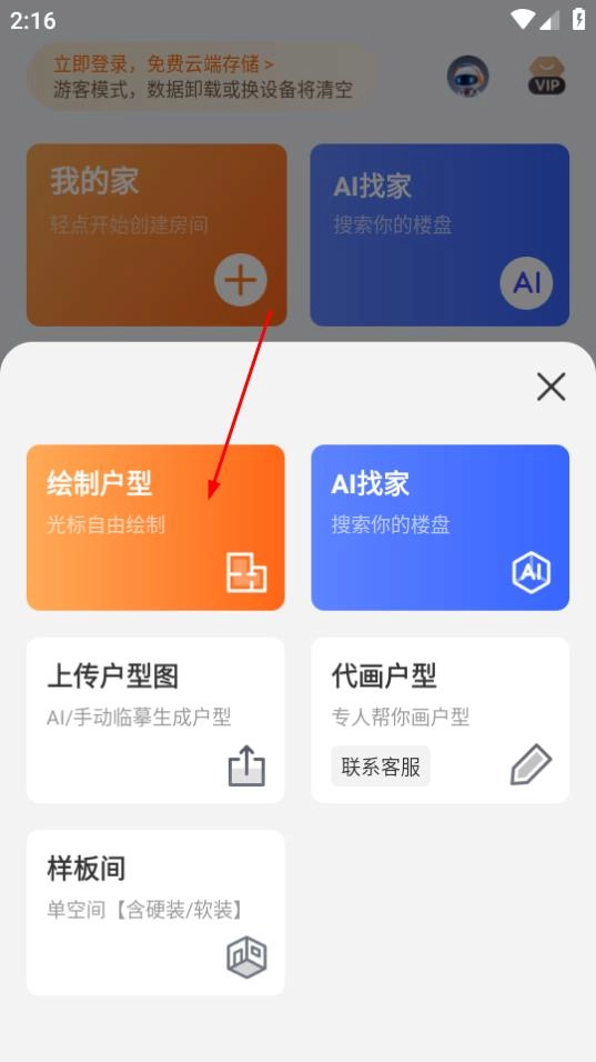 在创建选择框中,点击“绘制户型”选项,即可进入户型绘制的引导页面。