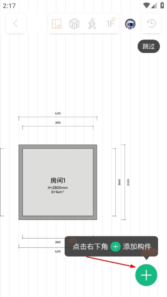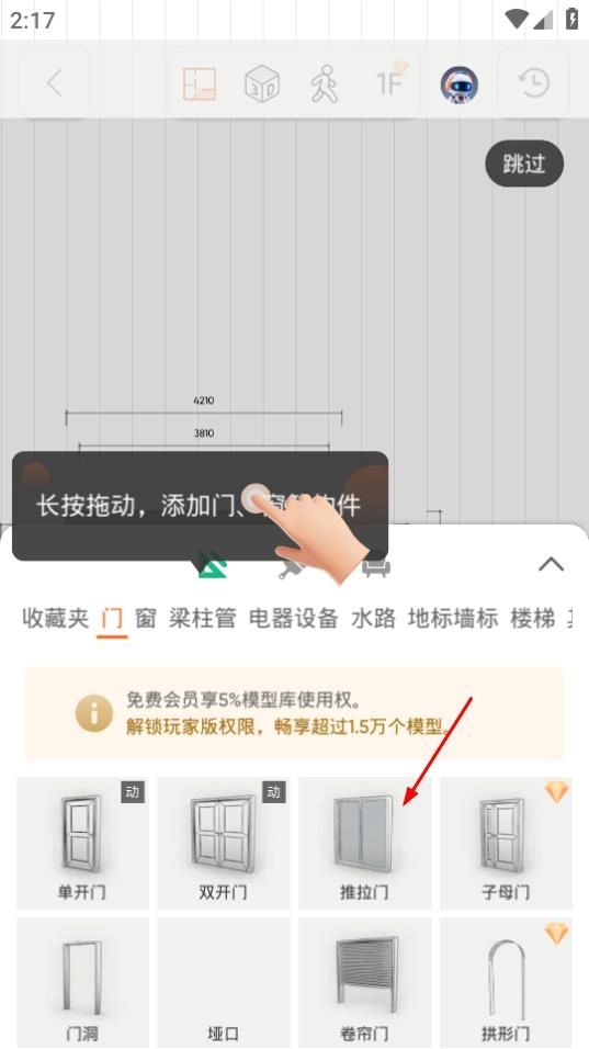 在构件选择界面,长按并拖动门这类构件,即可将其添加至户型内。