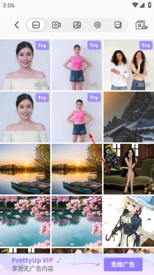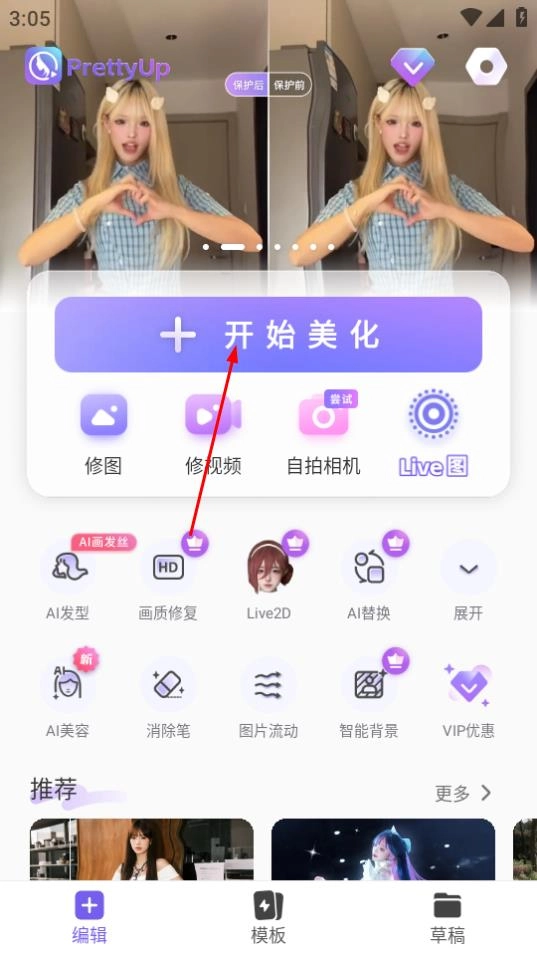 打开PrettyUp应用,点击“开始美化”按钮,随后进入素材选择界面。