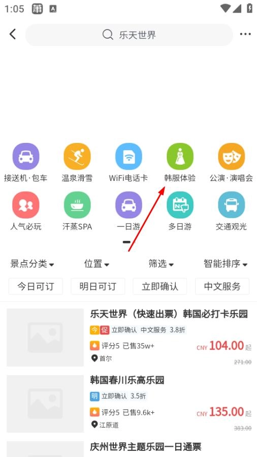 在景点门票分类页面,点击韩服体验选项,即可进入韩服体验项目的列表页面。
