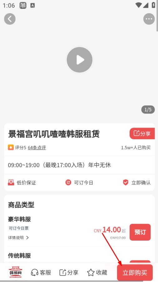 在项目详情页点击“立即购买”按钮,即可完成韩服租赁的购买流程。