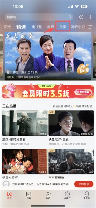 1、打开视频类应用,点击儿童分类标签,进入儿童动画专区。
