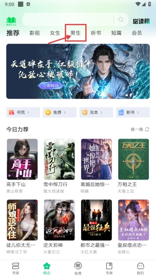 打开小说阅读类应用,点击顶部的男生分类标签,即可进入男生小说分类页面。