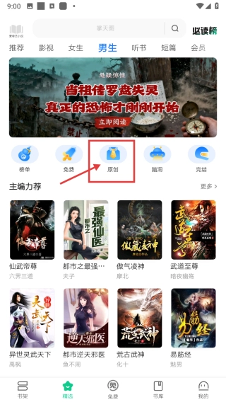 在男生小说分类页面,点击原创选项,进入原创小说列表页面。