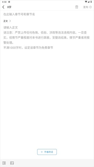 5、接下来便能够着手码字了,完成一章内容后,点击右上角的发布按钮。