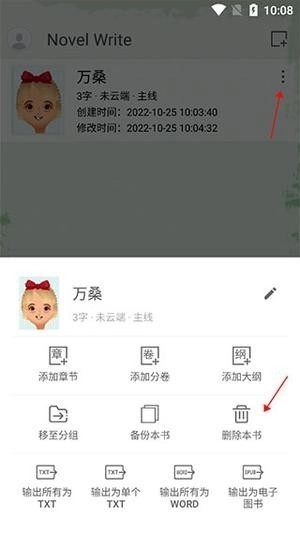 2、找到你想要删除的作品,点击该作品右侧的三点图标,在弹出的页面里,点击【删除本书】选项。