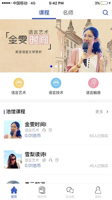 池馆是一款专注于英语在线学习的教育类软件,围绕学生英语能力提升和教师教学管理的实际需求,构建起融合学习与教学功能的综合平台。平台整合了海量优质在线课程与音频资源,所有内容均由国内英语教育领域的知名教授及资深教师牵头打造,既紧密契合学习者的兴趣方向,又深度衔接大学英语课堂的教学进度,还配备了对应的教材资源。