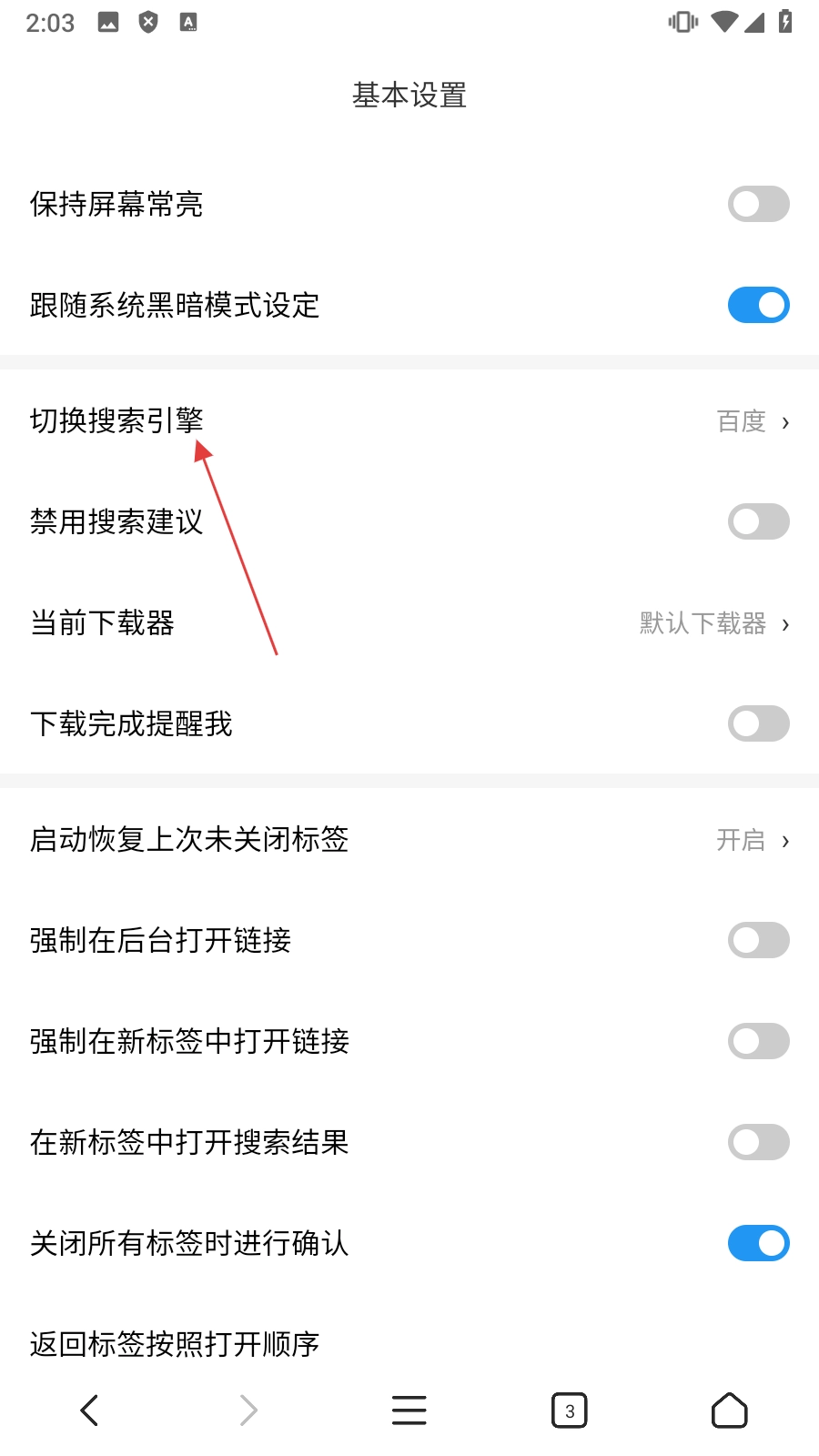 4、进入基本设置页面后,点击【切换搜索引擎】按钮,就能完成搜索引擎的切换操作。