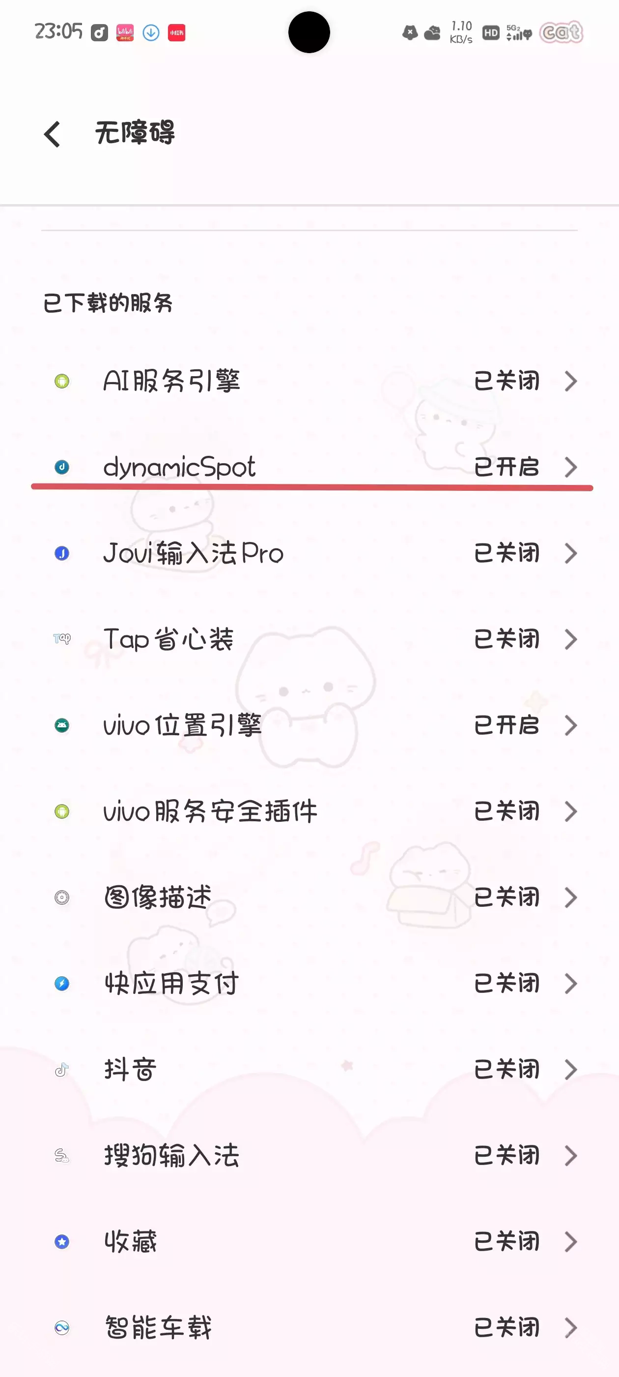 3. 找到无障碍选项,进入已服务页面,找到DynamicSpot,开启第一个开关。