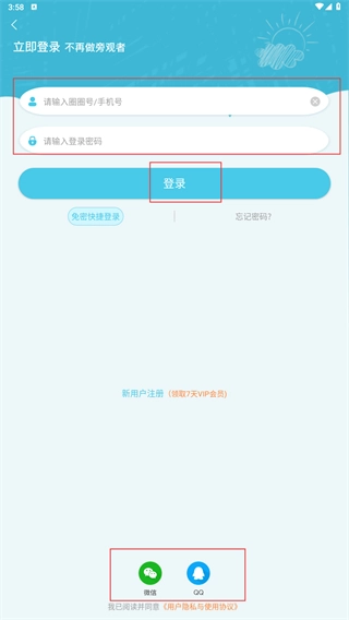 在登录页面,用户既可以选择输入圈号或手机号并搭配密码进行登录,也能够通过微信或QQ的快捷方式完成登录操作。