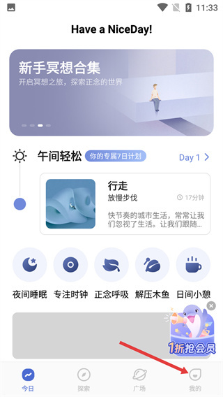 进入主界面后,能看到包括【新手冥想合集】在内的内容,点击底部导航栏中的【我的】选项,就能进入与个人功能相关的页面。