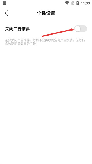 4、进入【个性设置】页面,找到【关闭广告推荐】的开关按钮,点击该开关即可关闭定向广告投放。