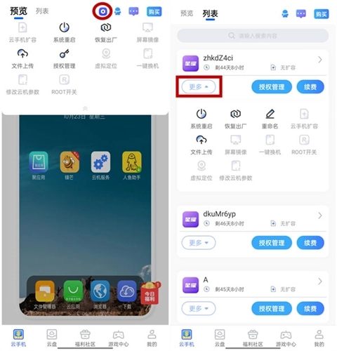 ②进入双子星应用后,点击页面上方的【列表】按钮,进入云手机列表界面。找到出现故障的云手机,点击其对应的【更多】选项,此时会弹出设置栏,选择点击【重启】或【恢复出厂】按钮,云手机便会开始执行重启或恢复出厂设置操作。请耐心等待30秒后,再重新进入“云手机”功能。