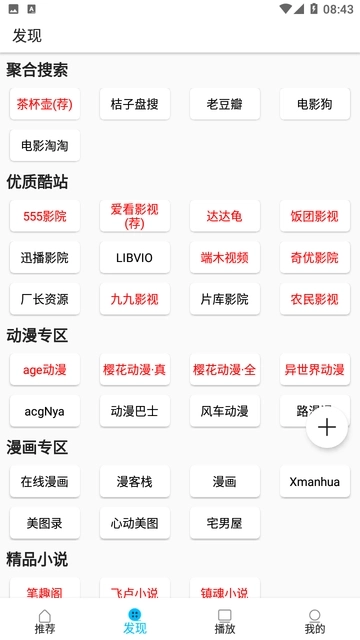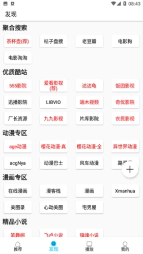 4、发现板块里汇集了各类站点,更厉害的是还支持播放功能和磁力资源,这里我就不做演示了,懂的都懂。