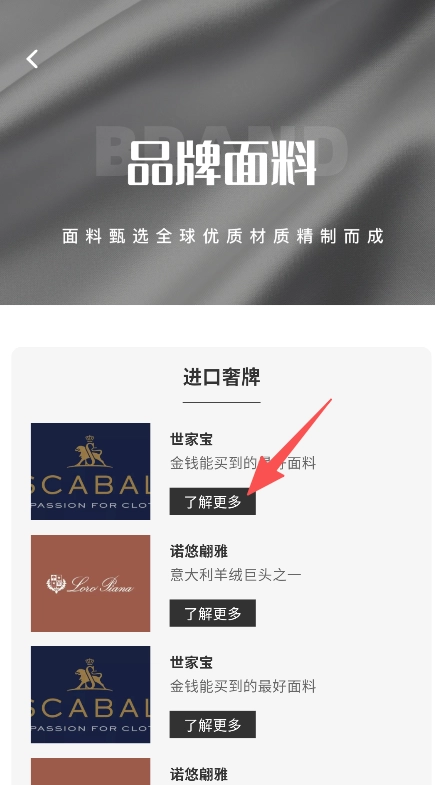 具备品牌面料展示功能,详细介绍世家宝等进口奢牌面料的创立历史、技术突破与材质优势,让用户在定制前充分了解面料品质,助力面料选择。