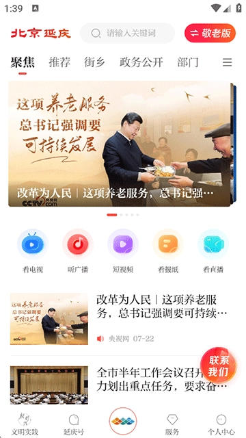 打开北京延庆,在首页能搜索查看各类延庆的新闻热点资讯;老年用户点击右上角切换至敬老版,使用起来会更便捷。
