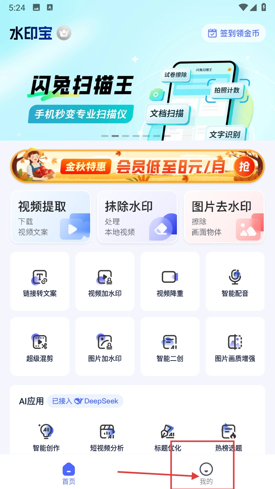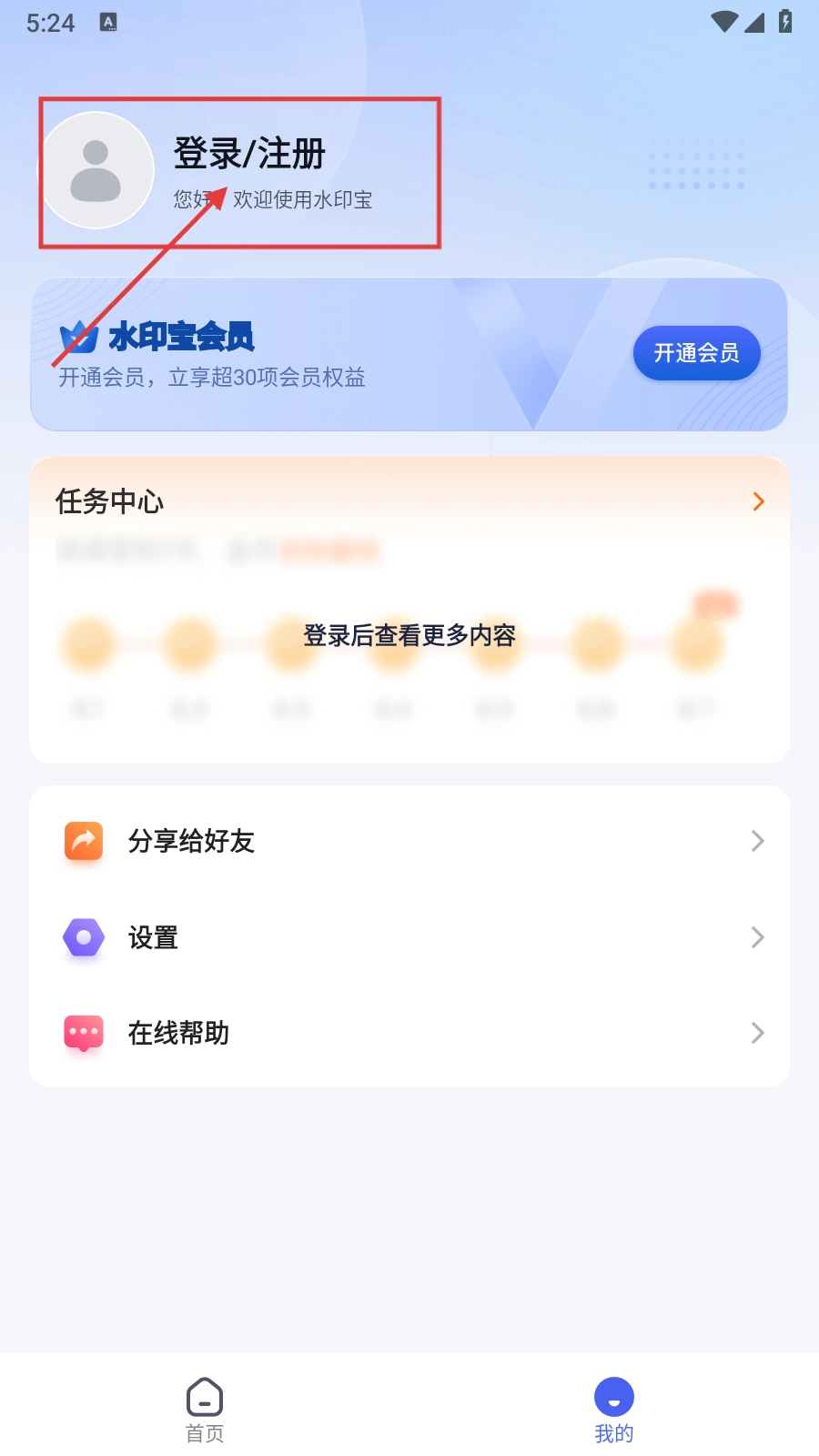 打开【水印宝】首页,点击右下角的【我的】按钮,就能进入个人中心页面了。