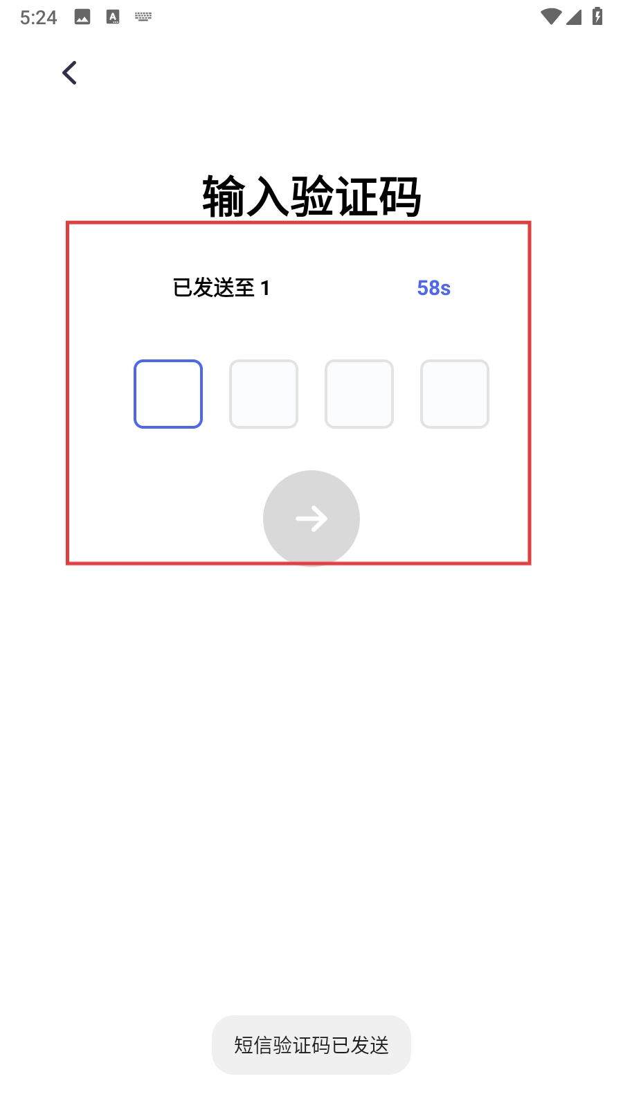 在验证码输入页面,把收到的验证码逐个填入四个方框内,就能完成登录流程。