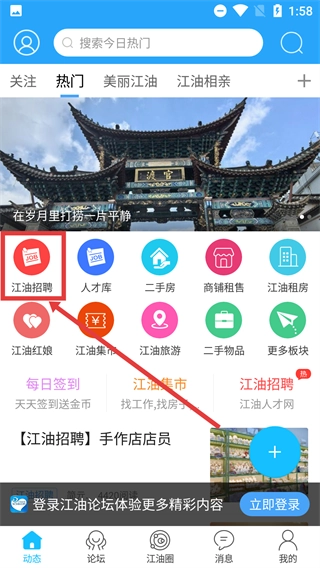 在首页找到【江油招聘】的功能入口并点击,即可进入招聘板块。