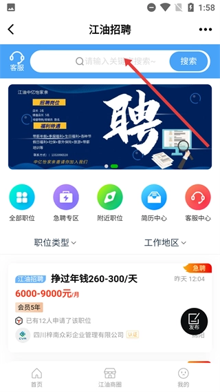 在【江油招聘】页面,点击搜索框并输入关键词,即可搜索到相关职位。