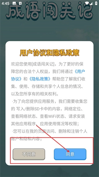 在成语闯关记启动后,先阅读用户协议与隐私政策,接着点击“同意”按钮,即可进入应用主界面。