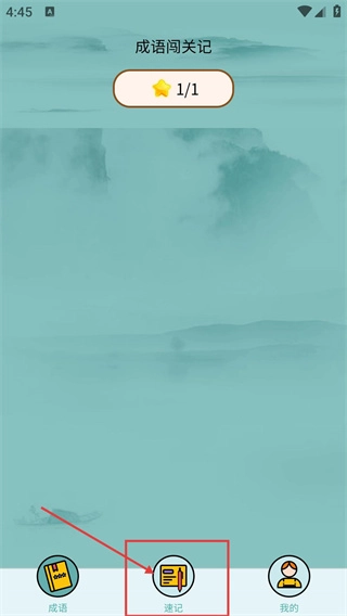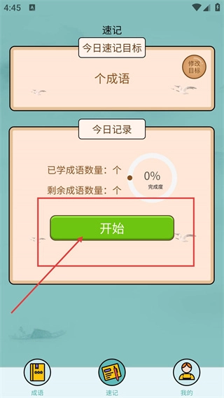 在速记页面,点击“开始”按钮,就能启动今日的成语速记任务,从而推进学习进度。