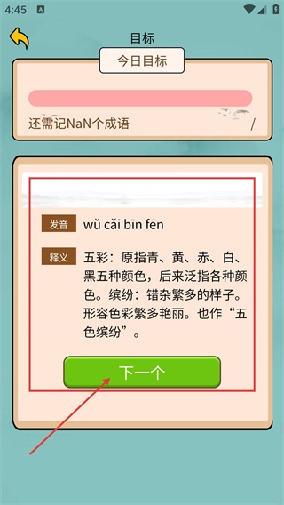 在速记任务页面,能够查看成语的发音和释义(例如“五彩斑斓”),完成当前学习后点击“下一个”按钮,即可继续学习下一个成语。