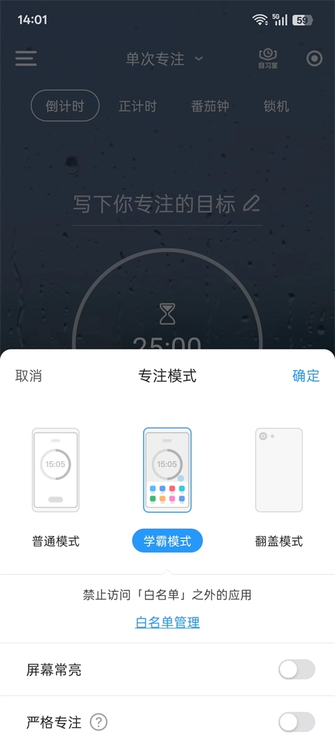 四种专注类型,除锁机外,每种类型下都有4种专注模式:常亮模式,学霸模式,翻盖模式,严格专注模式。