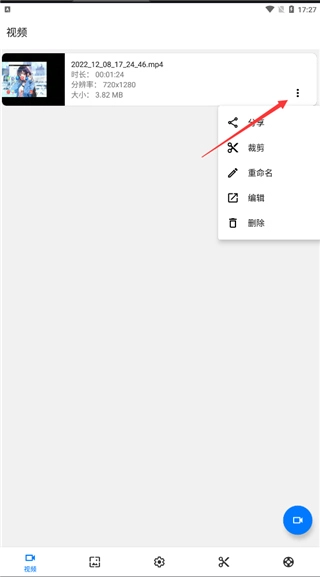 点击录制视频后,后面还有一个选项,点击打开该选项,还能对视频进行分享、裁剪、重命名、编辑以及删除等操作。