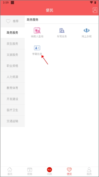 1、从首页切换至便民界面,点击政务服务板块中的“学籍信息”选项。