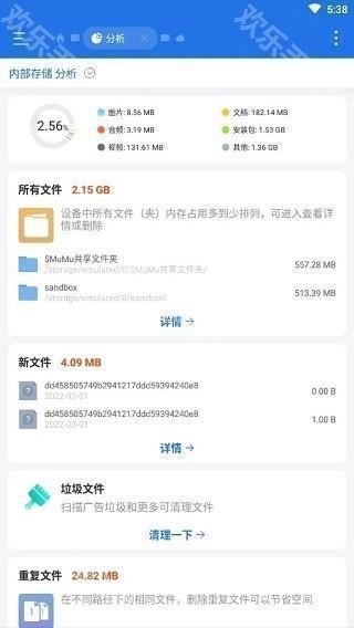 打开快捷导航后,依次进入工具板块并选择文件分析器,该功能可展示sdcard的总容量、已使用容量和剩余可用容量,同时呈现各个文件夹或文件的大小、占比数据,以及它们包含的子文件/子文件夹数量;长按对应项目即可直接执行删除操作。点击地址栏可实现外置存储卡的切换。若点击“目录分析”选项,则能显示当前路径下图片、音频、视频、文档、安装包及其他类型文件各自占用的容量情况。