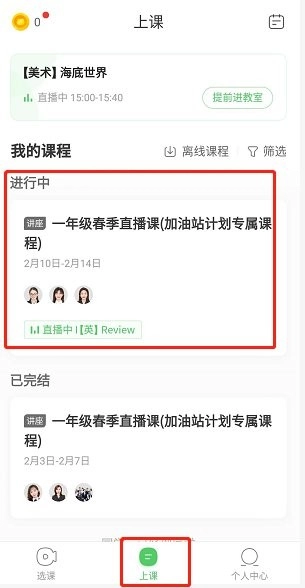 2、点击“上课”选项,在“进行中”的课程列表里找到你已经报名的课程,然后点击进入该课程页面。