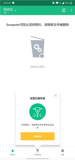 《Dumpster专业版》解锁了更多专业功能,新增密码与权限设置选项。这款恢复软件不仅功能强大,普通用户也能轻松上手——借助自动清理和深度扫描功能,用户可快速定位意外删除的重要文件,支持即时恢复;同时提供灵活的手机云存储服务,目前干扰,便于后续检索与恢复。此外,高级云存储以极低成本为移动用户提供可靠的设备备份,全程骚扰,带来清爽使用体验。