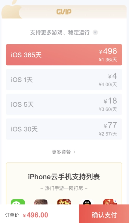 2、选择虚拟ios云手机套餐、优惠券、支付方式,勾选《iPhone云手机协议》后,点击“确认支付”