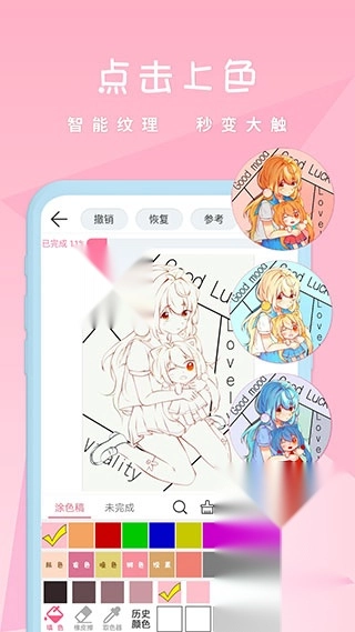 2、选择心仪的图片进入涂色界面,通过左右滑动屏幕挑选合适的颜色。