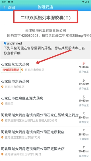 4、在搜索结果对应的附近药店页面中,找到显示药品在售情况的药店列表,点击想要查看的药店名称(例如“石家庄永北大药房”),就能查看该药店的详细信息。