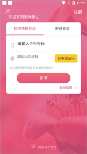 打开【爱我崇左】,找到【我的】选项并点击进入登录界面,按照页面指引输入手机号码,再获取并填写短信验证码,就能完成登录操作。