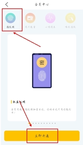 3、最后就是这样的界面,开通会员之后即可将设置指纹锁,保护自己的日记安全啦!