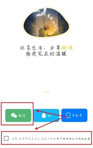 2、接着在登录界面就可以看到下面有三种方式,第一个就是微信登录了,在登录前不要忘记选中最下面的小框框哦~