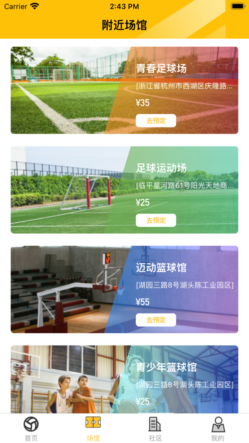 2、用户可以在平台进行预约多种场地,包括足球、篮球、游泳馆等场地;