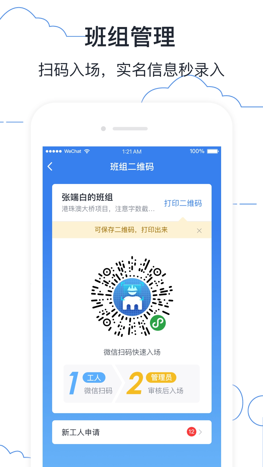班组长可以在客户端管理工人考勤和人员工资,工人可以在上面进行实名认证、考勤、工资单核对等操作。