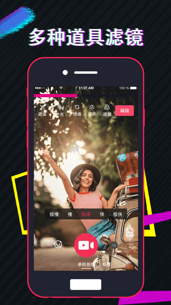 1、实时滤镜高清拍摄,支持多段拍摄,直接视频美化,闪光灯补光、实时美白、多分辨率、背景音乐可选。