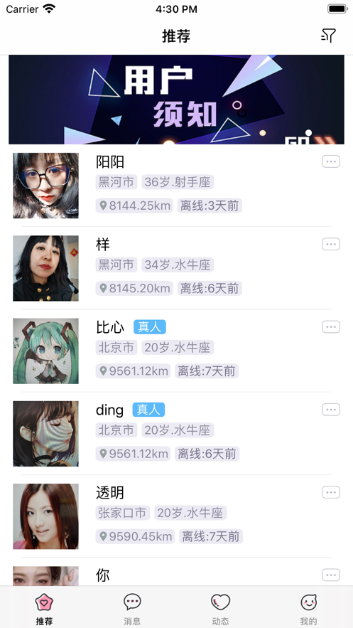 优质的交友互动app,展示自己的个人魅力,赢得更多异性用户的芳心,用户还能够一键筛选出附近的人,结识到更多同城的朋友!