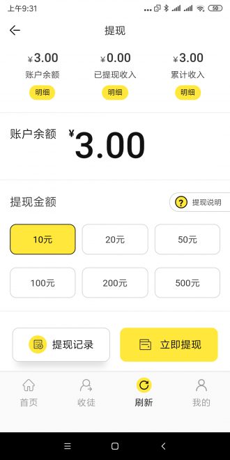 4、如果提现门槛低,1元可以提现到账户。